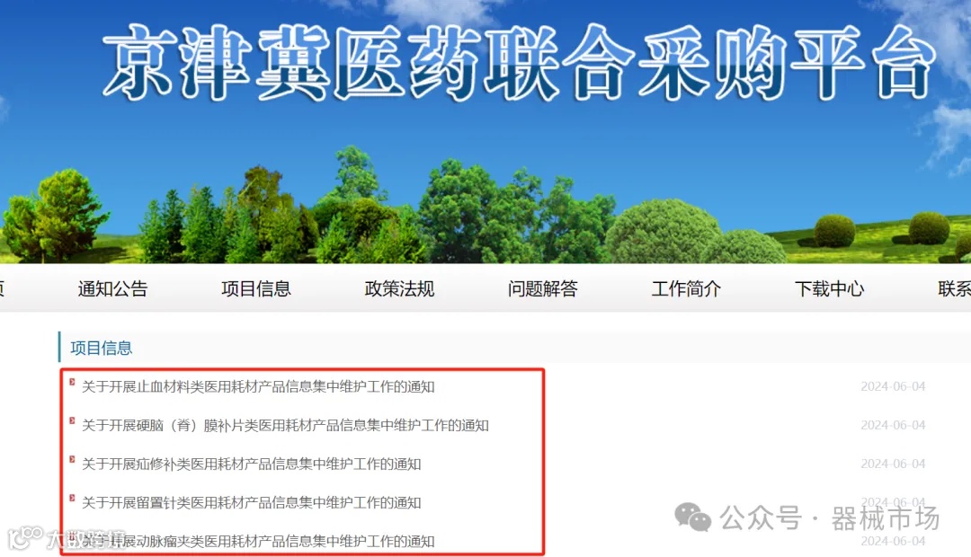 2024年6月4日,京津冀医药联合采购平台一连发布五则关于开展医用耗材产品信息集中维护工作的通知,涉及品种为动脉瘤夹、留置针、疝修补、硬脑(脊)膜补片、止血材料,计划自6月6日起开始信息集中维护,后续将开展带量联动采购。