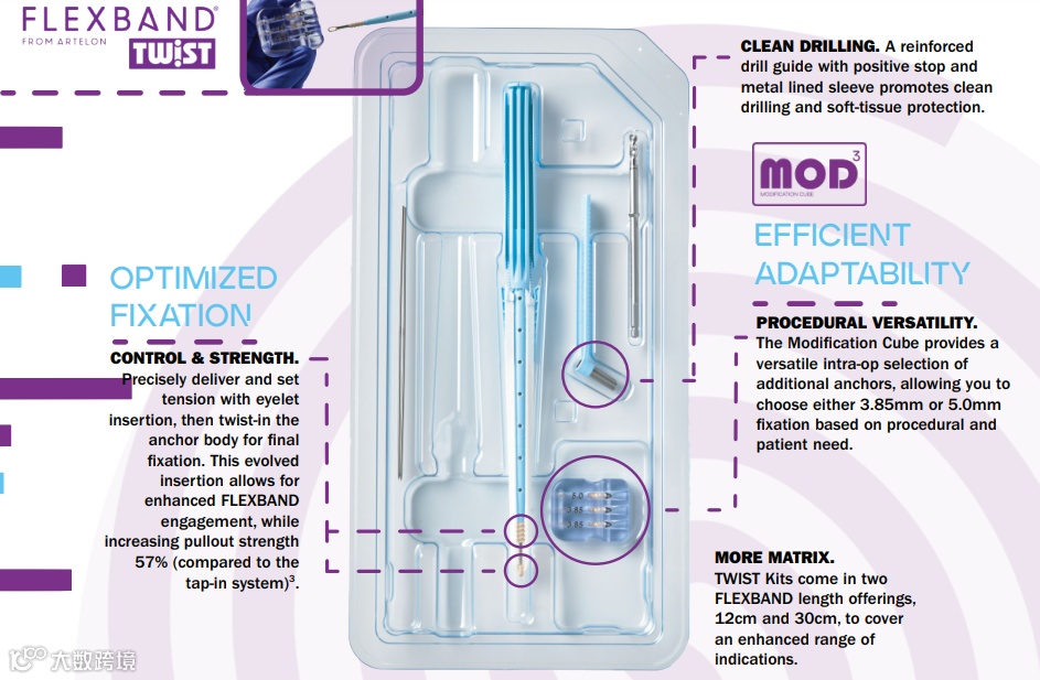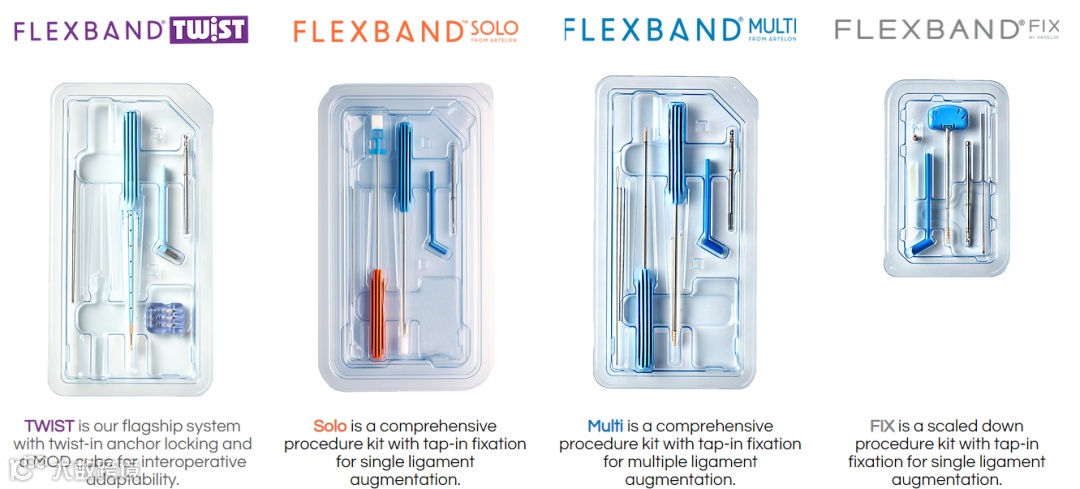 FlexBand Twist、FlexBand Solo、FlexBand Multi 和 FlexBand Fix 系统在一次性无菌泡罩内为骨科医生提供了全套工具和植入物,针对特定的适应症。