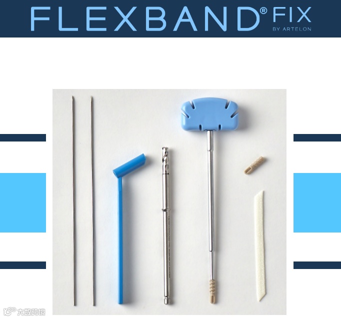 缩小型手术套件,带有用于单韧带增强的固定装置;包含一个 0.5 厘米乘 8 厘米的 FlexBand 和两个固定器。