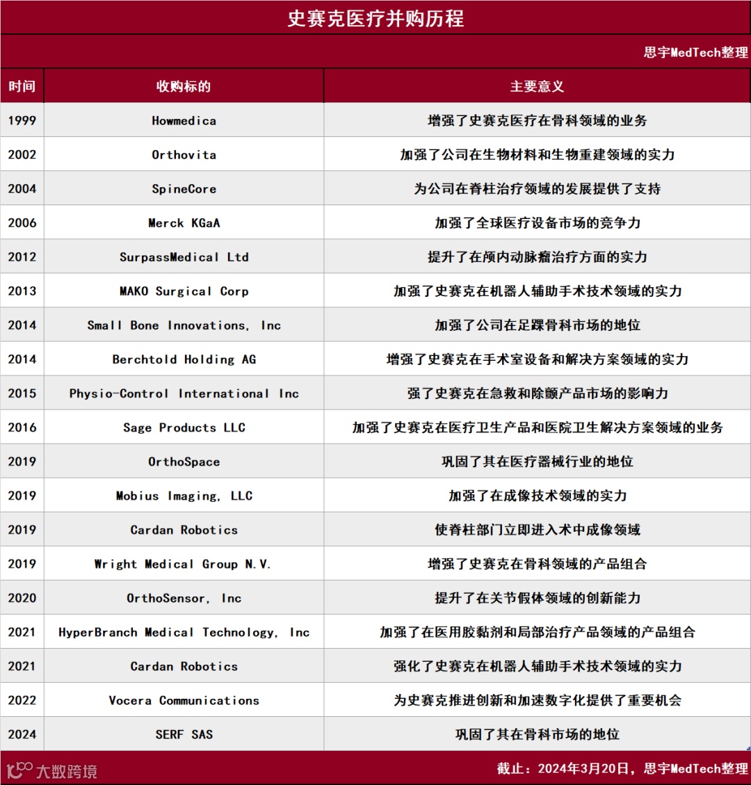 距现在最近的一次收购是:2024年3月21日,史赛克宣布完成了对法国的关节置换公司SERF SAS的收购。
