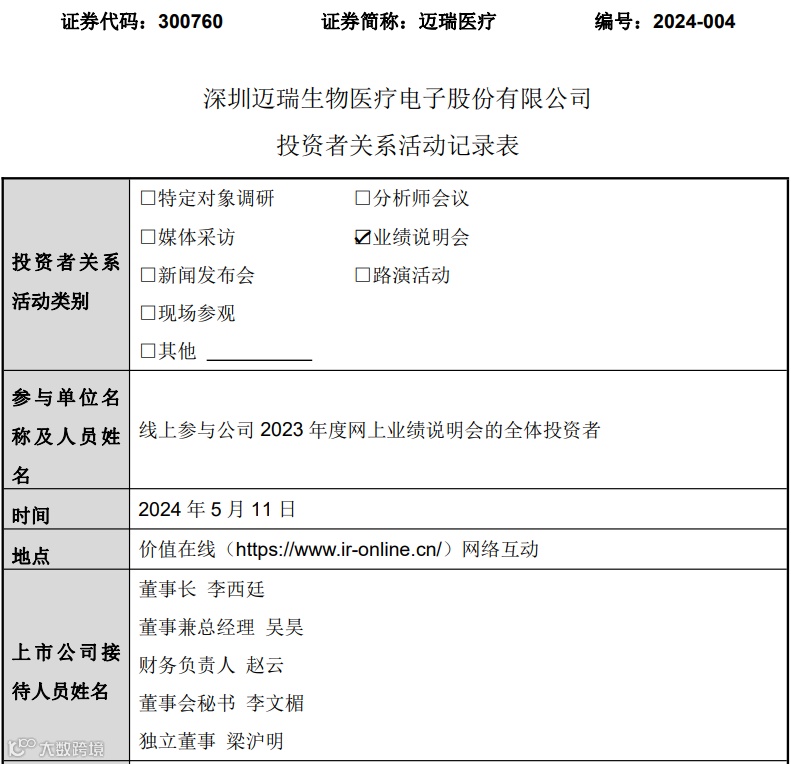 2024年5月11日,深圳迈瑞生物医疗电子股份有限公司(简称“迈瑞医疗”,300760.SZ)发布了投资者关系活动记录表,公司就全球化布局、产品服务、国内外市场等问题做出回答。