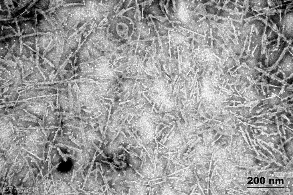 重组tau441(2N4R)、P301S突变型前体纤维原(PFFs)的透射电镜图 (TEM)。前体纤维原经超声处理,并用乙酸双氧铀染色。 |