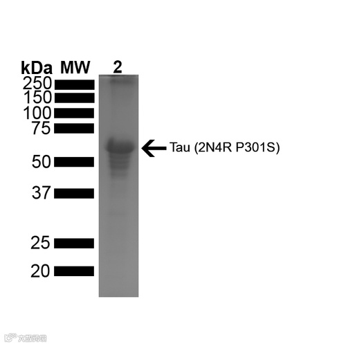 67 kDa 人Tau 蛋白2N4R P301S突变型 前体纤维原 (SPR-329).SDS-PAGE图 Lane 1: MW Ladder. Lane 2: Tau 蛋白前体纤维原(SPR-329) |