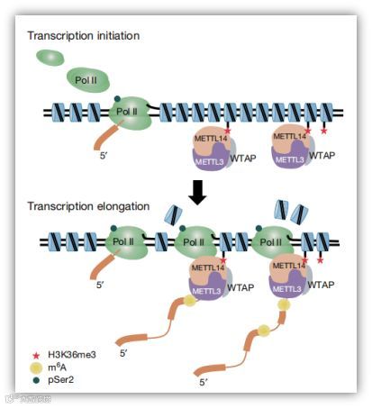 该文章首次揭示了组蛋白H3的36位赖氨酸位点的三甲基化修饰(H3K36me3)修饰能够被RNA甲基化转移酶METTL14识别,同时与RNA聚合酶II结合,介导甲基转移酶复合体(MTC, methyltransferase complex)在转录延伸过程中对新生RNA的m6A甲基化修饰。