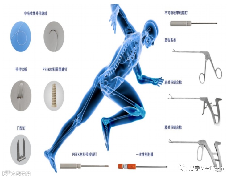 主要是指由于运动损伤导致的韧带、关节囊、肌腱等软组织损伤治疗的骨科植入 物,具体产品包括固定螺钉、带袢钛板等。