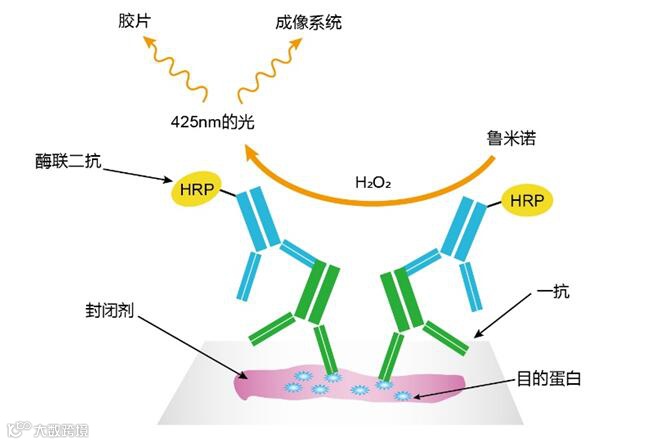 检测时,将A液和B液按照1:1的比例进行混合配制成工作液,均匀的滴加到膜上。此时,在二抗上带有的标记物——辣根过氧化物酶(HRP )的催化作用下,鲁米诺与过氧化氢反应生成一种过氧化物,过氧化物不稳定随即分解,形成一种能发光的电子激发中间体,当电子激发中间体由激发态返回至基态时,就会产生荧光。