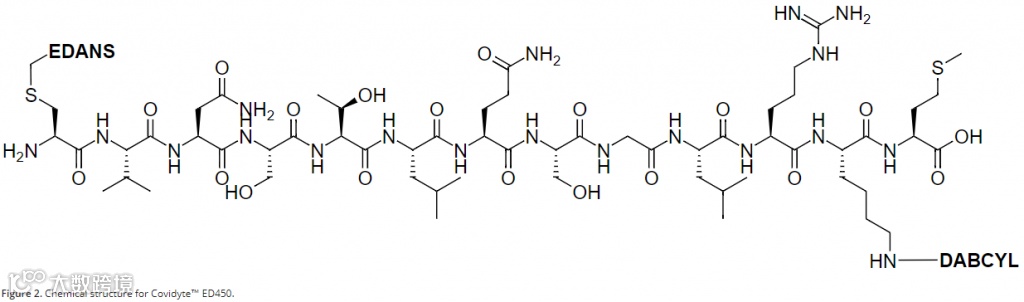 Covidyte™ED450是一种肽底物,含有11个氨基酸序列,可以被冠状病毒蛋白酶切割。深色FRET肽的N和C端分别包含Dabcyl(淬灭剂)和Edans(供体),当该肽完整时,Edans的荧光可被Dabcy有效地淬灭。