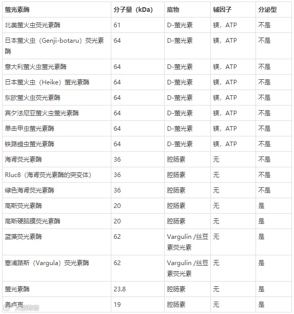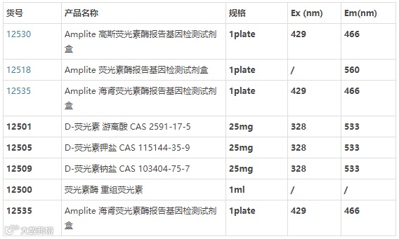 各类萤光素酶底物,辅因子和物理特性