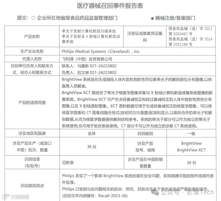 2023年12月25日,国家药品监督管理局官方网站公告,飞利浦公司正主动召回特定型号的单光子发射及X射线计算机断层成像系统、单光子发射计算机断层扫描系统,此次召回级别为一级召回,型号及序列号如下: