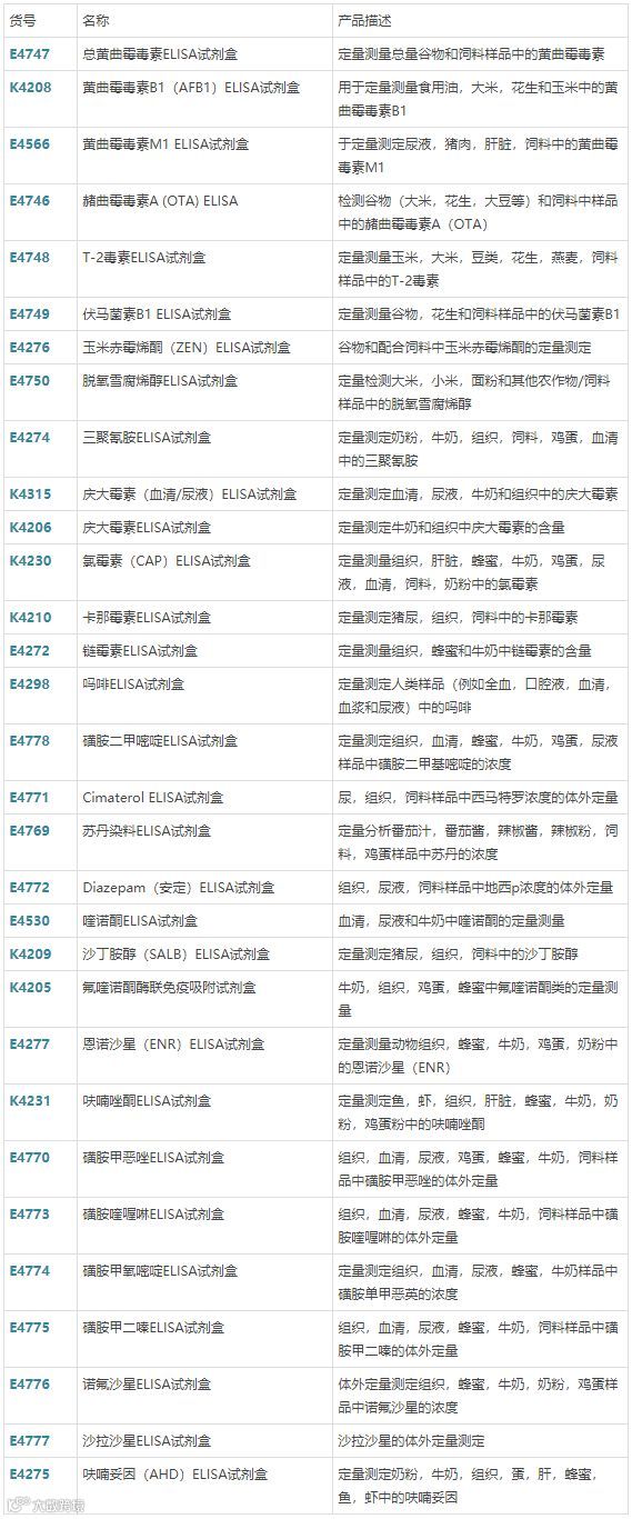 最近,美国著名的生物检测工具供应商Biovision开发了一系列的检测各类食品,饲料,组织及生物液体中真菌毒素和抗生素的ELISA试剂盒,方便我们更简便,快捷,精确定量各类样本中的毒素: