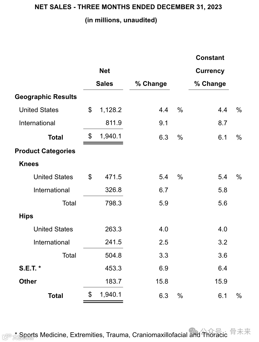 运动医学、四肢、创伤、颅颌面和胸部销售额:4.533亿美元(增长6.9%)
