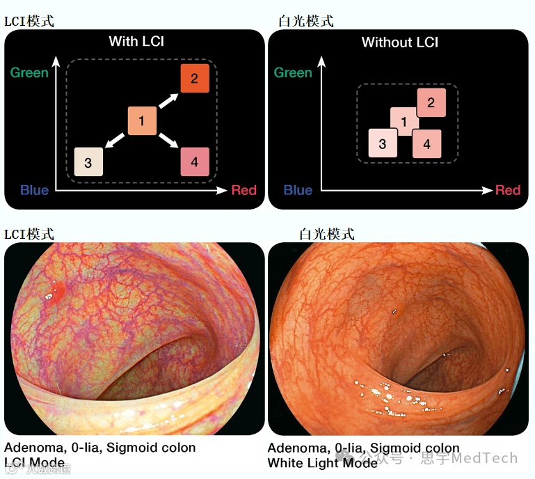 最佳光谱和先进的信号/图像处理相结合,使 LCI 能够比白光成像更有效地区分红色色调。