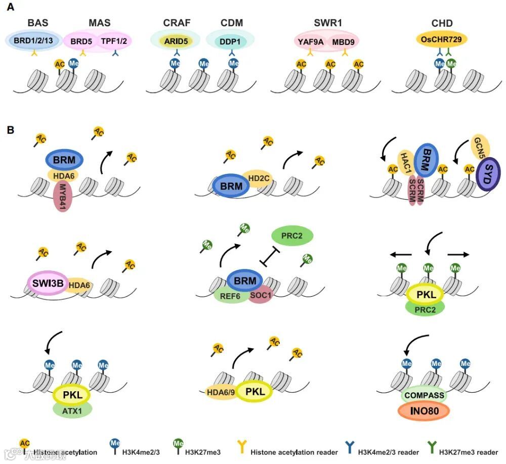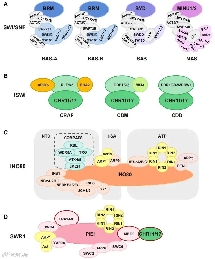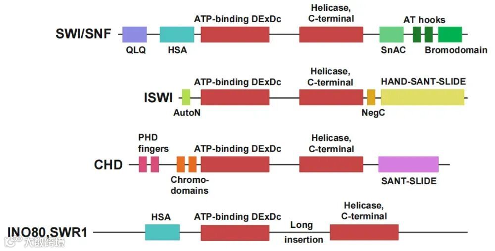 SWI/SNF亚家族蛋白通过核小体滑移、组蛋白八聚体驱逐或二聚体置换来改变染色质可及性,对染色质开放和转录激活至关重要。 -