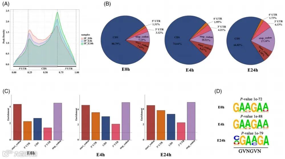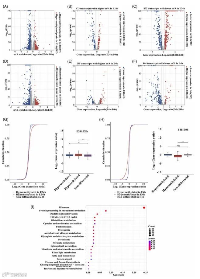 E24h vs E0h:共1414个差异m6A峰(507个高甲基化、907个低甲基化)(Fig.3A),分别关联到473个和872个转录本(Fig.3B,3C);其中低甲基化基因整体表达下降,高甲基化基因表达上升(CDF曲线显著分离,Wilcoxon P<0.001)(Fig.3G)。 -