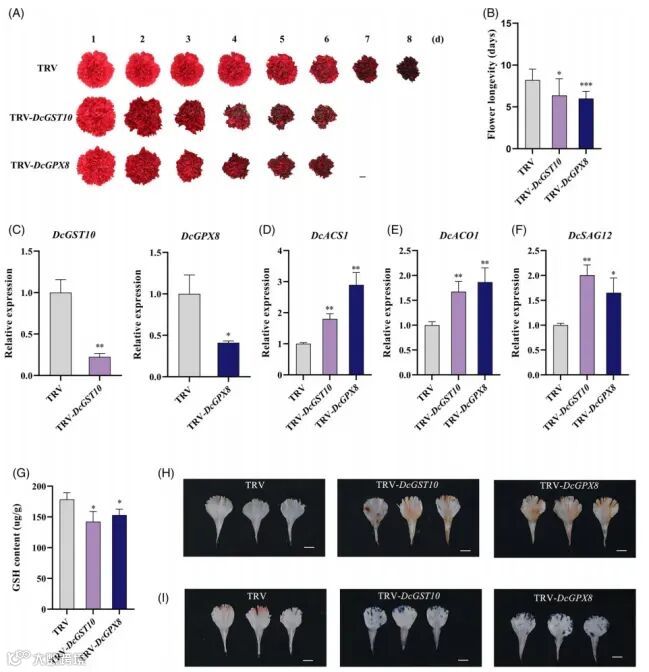 VIGS:DcGST10或DcGPX8表达量下降70–80%;瓶插寿命缩短3–4d;GSH含量下降约35%;DAB/NBT染色表明H2O2和O2-大量积累;乙烯合成基因DcACS1、DcACO1及衰老标记DcSAG12显著上调(Fig.5)。
