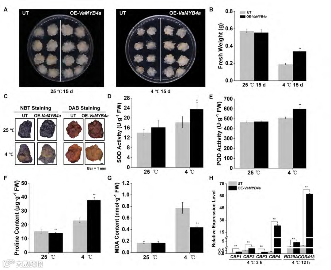 为了研究VaMYB4a在冷胁迫耐受性中的作用,作者构建了过表达VaMYB4a的转基因葡萄愈伤组织(OE-VaMYB4a)。使UT(未转化的,UT)和OE-VaMYB4a愈伤组织在25°C下生长或在4°C下经受冷胁迫15天。在正常生长条件(25°C)下,UT和OE-VaMYB4a愈伤组织在正常生长条件(25°C)下没有观察到显著差异。然而,在冷胁迫下,与UT愈伤组织相比,OE-VaMYB4a愈伤组织的外观明显更好、鲜重更高(图4A-B)、活性氧清除酶活性更强(图4D-E)。而MDA(丙二醛)水平降低较低,表明脂质过氧化减少,并且增强了抗氧化保护(图4F-G)。为了进一步阐明VaMYB4a介导的冷胁迫耐受性的分子机制,作者分析了CBF-COR途径冷应答基因的表达水平。qRT-PCR分析表明,在低温胁迫下CBF1、CBF2、CBF3、CBF4、RD29A和COR413在OE-VaMYB4a愈伤组织中的表达显著上调,表明VaMYB4a正调控这些关键的低温响应基因。值得注意的是,在冷驯化条件下(4℃,3h),VaCBF4基因的相对表达量是UT愈伤组织的24.44倍。此外,VaMYB4a还上调了CBF-COR信号通路中其他冷应答基因的表达(图4H)。以上结果表明,VaMYB4a通过调节葡萄愈伤组织的抗氧化活性、脯氨酸含量和MDA含量以及CBF-COR通路基因的表达增强耐冷性。