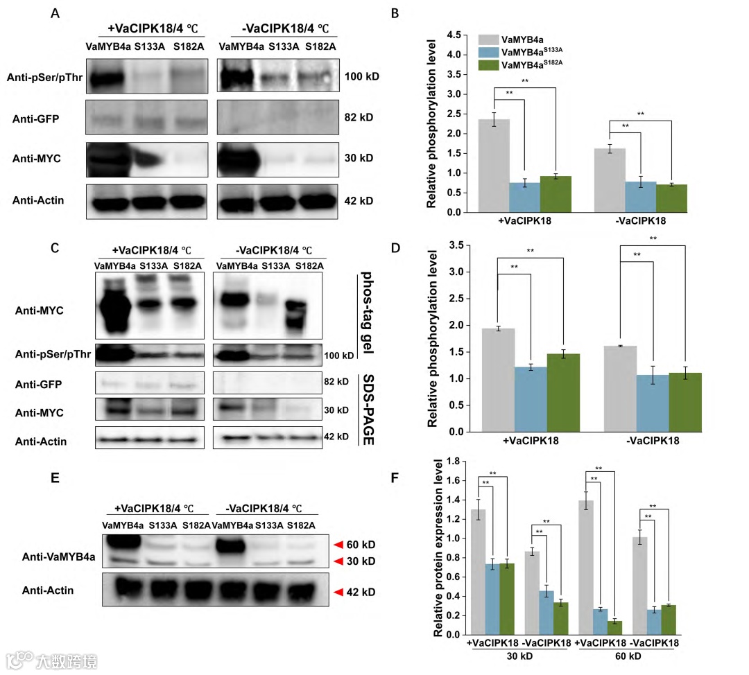 为了确定VaMYB4a磷酸化是否直接由其上游相互作用伴侣丝氨酸/苏氨酸蛋白激酶VaCIPK18介导,作者进行了体内磷酸化测定,结果证实VaMYB4a是VaCIPK18的磷酸化底物,关键磷酸化位点是丝氨酸残基S133和S182。VaCIPK18与VaMYB4a共表达导致VaMYB4a磷酸化水平显著增加。相反,这些关键磷酸化位点的突变导致磷酸化水平显著降低(图2A-B),强调了这些残基在VaCIPK18对VaMYB4a的磷酸化中的重要作用(图2A-B)。作者利用磷标记试验,进一步证实体内磷酸化结果(图2C-D)。此外,在磷酸化位点具有突变的样品中VaMYB4a磷酸化水平出现下降,这与体内趋势一致(图2C-D)。总的来说,这些结果证明VaMYB4a是VaCIPK18的直接磷酸化靶标。