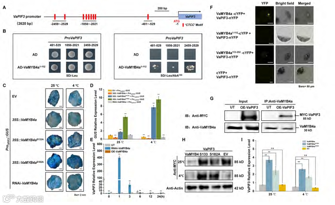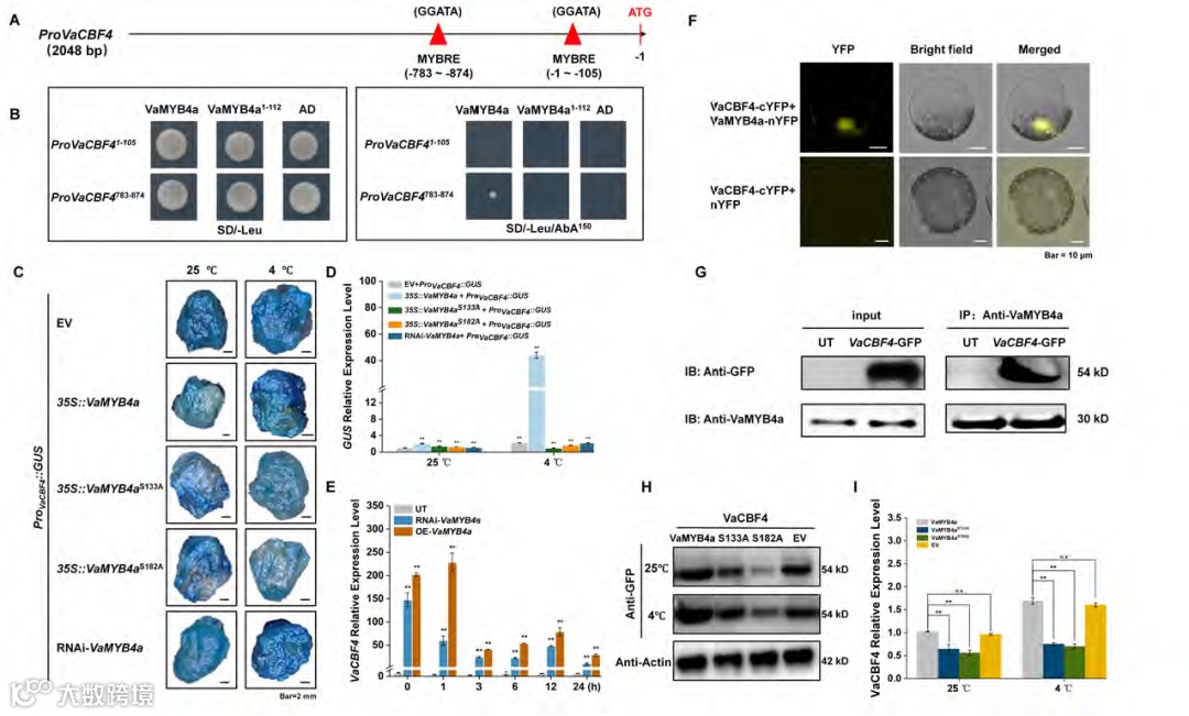 qRT-PCR结果表明VaMYB4a在正调节CBF途径内关键基因的表达中的作用,VaCBF4的显著上调(图4H),发现VaMYB4a抑制VaPIF3的表达,这进而减少VaCBF4蛋白的积累。作者根据之前结果作出假设推断,即VaMYB4a可能通过抑制VaPIF3活性直接或间接促进VaCBF4表达。为了进一步验证这一假设,作者对VaCBF4基因启动子区的顺式作用元件进行了预测分析,发现它含有多个MYB结合位点(MYBRE)以及冷响应元件(EBOX和LTRE)等(图9A)。与作者的预期相反,Y1H检测表明,VaMYB4a可以直接结合VaCBF4启动子,表明VaMYB4a可以直接刺激VaCBF4表达的替代机制(图9B)。为了进一步评估VaMYB4a结合对VaCBF4表达的功能影响,作者进行了瞬时β-葡糖醛酸糖苷酶(GUS)表达测定。与对照相比,VaMYB4a显著增强了冷胁迫条件下由VaCBF4启动子驱动的GUS活性(图9C-D)。这种效应虽然较弱,但在VaMYB4a突变体S133A和S182A中也观察到。相反,在RNAi-VaMYB4a愈伤组织中GUS活性显著降低,表明VaMYB4a正调节VaCBF4表达(图9D)。为了评估VaMYB4a对冷响应基因表达的调节影响,作者通过qRT-PCR测量了UT、OE-VaMYB4a和RNAi-VaMYB4a葡萄愈伤组织中的VaCBF4转录物水平。在冷胁迫(4°C)下,与UT和RNAi-VaMYB4a愈伤组织相比,OE-VaMYB4a愈伤组织中的VaCBF4表达显著更高,表明VaMYB4a响应于低温正向调节VaCBF4诱导(图9E)。VaMYB4a和VaCBF4之间的相互作用使用BiFC测定在体内进一步证实(图9F)。Co-IP测定进一步验证了这种体内相互作用(图9G)。在冷应激下,VaMYB4a的存在导致VaCBF4蛋白水平增加,而对照显示较低的VaCBF4水平(图9H)。WB定量结果也证实了个这一结论(图9I)。这些结果表明,在低温胁迫下,VaMYB4a与VaCBF4相互作用,并通过与其启动子结合并促进其蛋白稳定性而正向调节VaCBF4的表达。