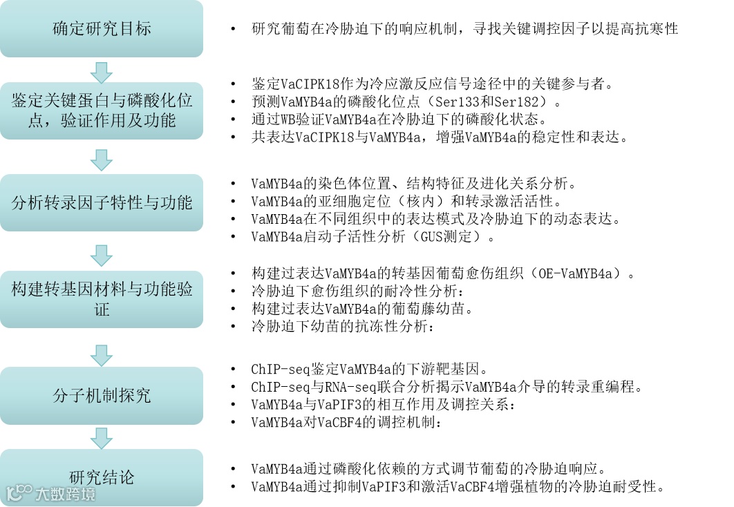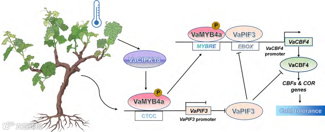 这篇研究揭示了VaMYB4a通过磷酸化依赖的方式调节葡萄的冷胁迫响应。VaMYB4a通过抑制VaPIF3和激活VaCBF4来增强植物的冷胁迫耐受性。这些发现为理解植物在冷胁迫下的转录响应提供了新的见解,并为提高作物抗寒性提供了潜在的遗传资源。