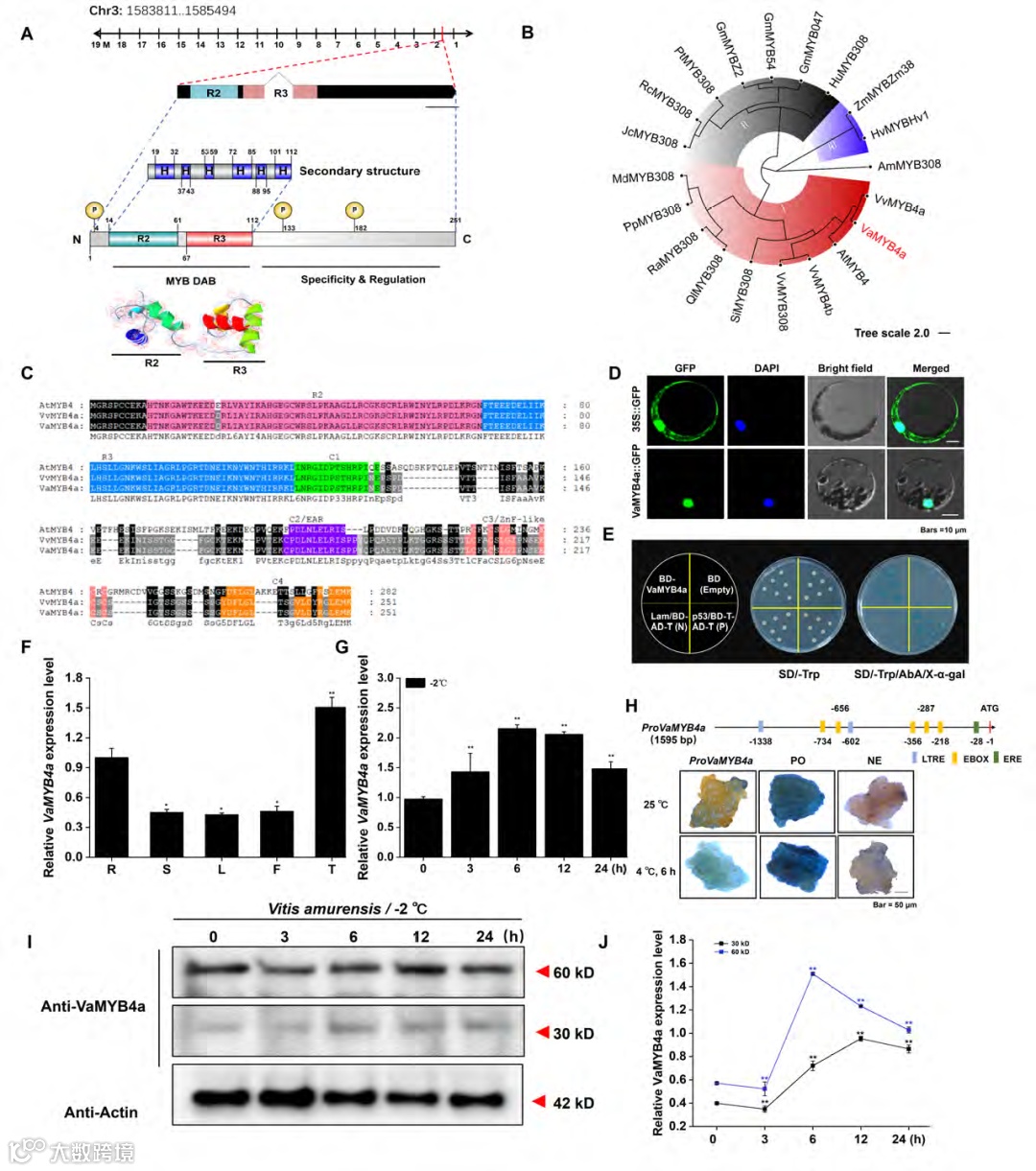亚细胞定位证实VaMYB4a定位在核内(图3D)。VaMYB4a在酵母细胞中表现出较强的转录激活活性(图3E)。作者进一步分析了VaMYB4a在Amur葡萄的不同组织部位的表达情况,发现在卷须中表达水平最高,在叶中表达最低(图3F)。采用qRT-PCR方法检测了低温胁迫下VaMYB4a的表达情况。在冷冻处理(-2℃)下,VaMYB4a表达在6h达到峰值,随后逐渐降低(图3G)。为了进一步研究VaMYB4a启动子的活性,在转基因'Chardonnay'愈伤组织中进行了GUS测定。与对照条件(25°C)相比,在冷胁迫条件(4°C持续6小时)下具有显著更高的强度(图3H)。这与qRT-PCR结果一致,WB分析表明-2℃处理下VaMYB4a蛋白水平在6小时达到峰值,随后下降(图3 I-J)。60-kDa条带对应于VaMYB4a蛋白的二聚体形式,而30-kDa条带代表单体形式,从WB结果看(图3J)二聚体形式(60kDa)显著增加,在6小时达到峰值(与对照比较高1.6倍),随后逐渐下降。平行地,单体形式(30kDa)表现出一定程度上升,但上升比二聚体形式低。这些结果共同表明,VaMYB4a是核定位的MYB转录因子,在冷胁迫反应中具有重要作用,在转录物和蛋白质水平上显示动态表达模式。
