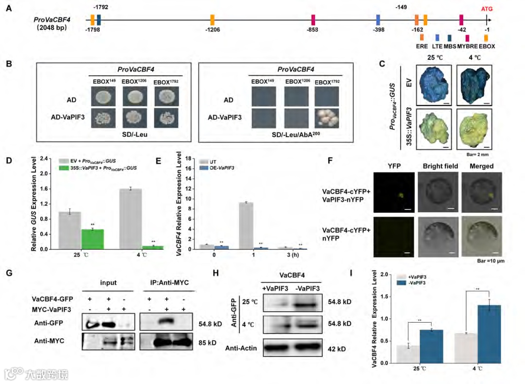 基于文献研究,发现拟南芥中的AtPIF3与EBOX顺式作用元件相互作用在AtCBF启动子区以调节基因表达。葡萄中有四个CBF家族成员,其中VvCBF4对低温的响应最强。因此,在本研究中,作者研究了VaPIF3和VaCBF4之间的潜在相互作用和调控关系。首先VaCBF4基因的启动子区域进行分析,识别了各种顺式作用元件,包括EBOX、MYBRE和其他元件(图8A)。Y1H测定证实,VaPIF3特异性结合VaCBF4启动子中的EBOX基序(图8B)。使用瞬时β-葡萄糖醛酸酶(GUS)表达分析评估了该相互作用的功能影响。与对照组相比,在正常和低温条件(4℃)下,VaPIF3均显著抑制了VaCBF4启动子驱动的GUS活性(图8C-D)。此外,在冷应激下OE-VaPIF3愈伤组织中VaCBF4的表达显著降低,表明VaPIF3负调节VaCBF4表达(图8E)。BiFC证实体内VaPIF3和VaCBF4之间的物理相互作用(图8F)。Co-IP进一步验证了这种体内相互作用(图8G)。半体内蛋白质降解试验、WB定量分析结果显示,VaPIF3促进VaCBF4在冷胁迫(4°C)下的降解(图8H-I)。这些发现表明VaPIF3直接结合VaCBF4启动子,抑制其表达并促进其蛋白在冷应激条件下降解。这种调节相互作用突出了VaPIF3调节葡萄藤中的冷应激反应的关键机制。