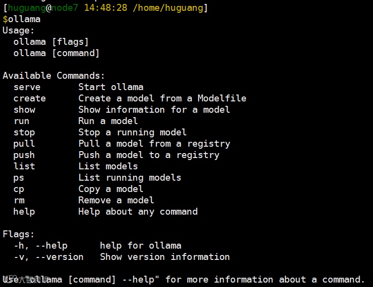 打开终端或命令行,输入ollama,出现如下帮助信息即代表安装成功。