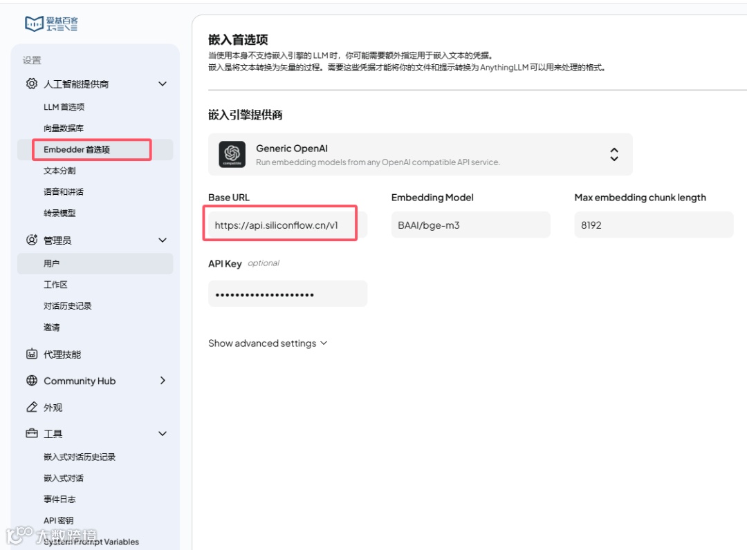 向量数据库使用默认的LanceDB即可。这里可以使用前面下载好的嵌入模型nomic-embed-text。这里依然选择API接入的方式。使用硅基流动平台选择模型BEG-v3。