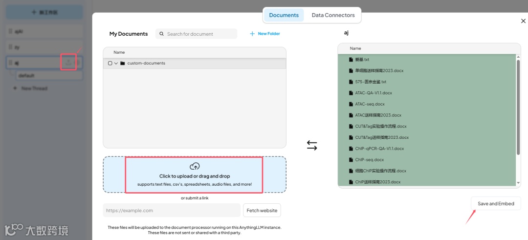 回到工作区主面板,点击工作区的文件上传按钮或者拖动文档。然后移动到工作区,点击Save and Embed等待。等待向量数据库构建完成即可使用。