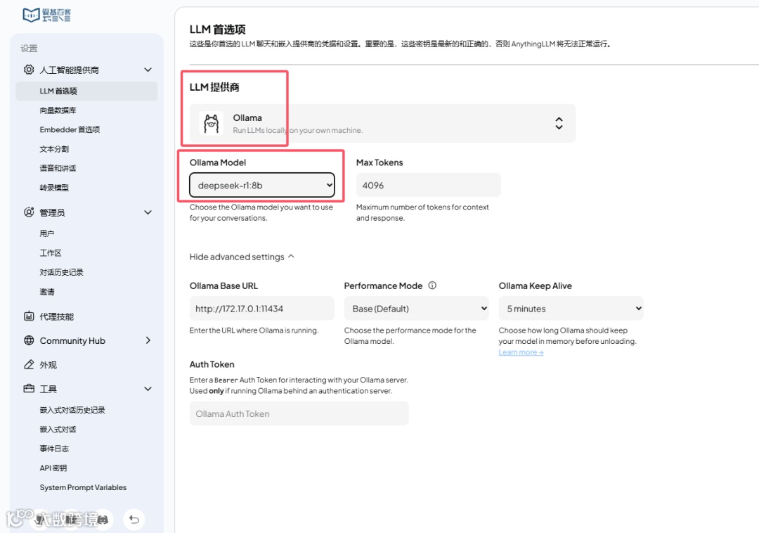 LLM提供商选择Ollama,Ollama Model选择刚才配置好的deepseek-r1::8b模型,这样就配置好了。由于本地运行模型硬件资源有一定的要求。我们可以选择API连接来高效调用大模型。可以使用硅基流动提供的接口,也可以使用抖音火山方舟提供的接口,目前注册都有送token。