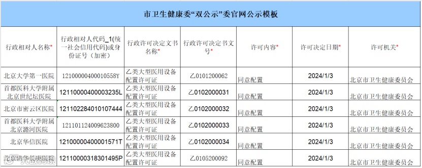 北京卫健委1月公布了一批乙类大型医用设备配置审核结果。