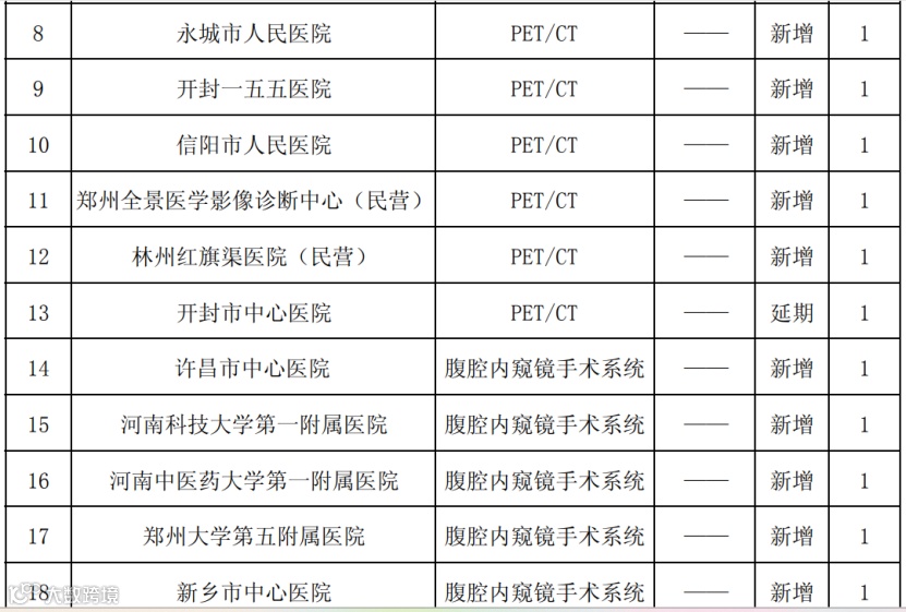 根据《通告》内容,同意新增配置X线正电子发射断层扫描仪(PET-CT)共3台,同意新增配置腹腔内窥镜手术系统共9台,同意新增配置医用直线加速器(LA)共7台。
