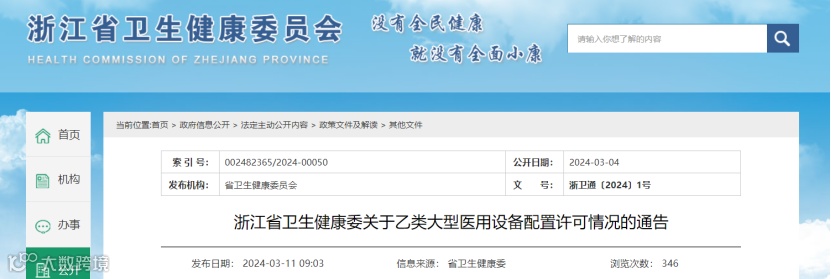 近日,浙江卫健委发布《浙江省卫生健康委关于乙类大型医用设备配置许可情况的通告》,公布2023年第四季度医疗机构申请配置乙类大型医用设备申请许可情况。