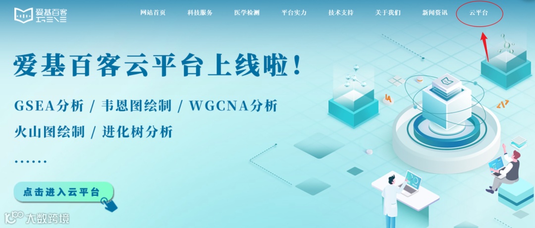 首先,打开爱基百客官网:http://www.igenebook.com;点击菜单栏最右侧“云平台”按钮。
