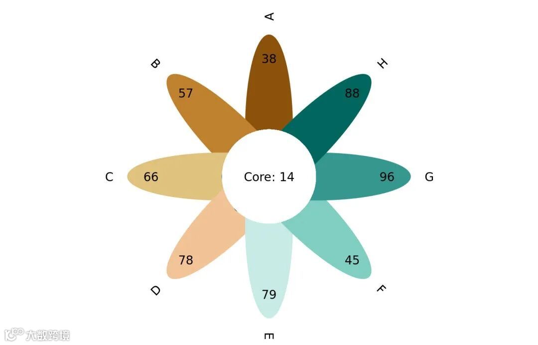 Venn图是一种用于展示两个或多个集合之间的关系的图形表示方法。它由英国逻辑学家和数学家约翰·维恩在1880年首次提出。不过,随着数据集的增加,Venn图的复杂度也会增加,如超过四集合Venn图对于人类视觉来说可能难以准确解释。花瓣图(Flower Plot)是一种韦恩图的一种变体或美化形式,通常用来展示多个集合(通常是 3~15 个)之间的重叠关系,但以“花瓣围绕中心”的形式展现,更具视觉美感与对称性。