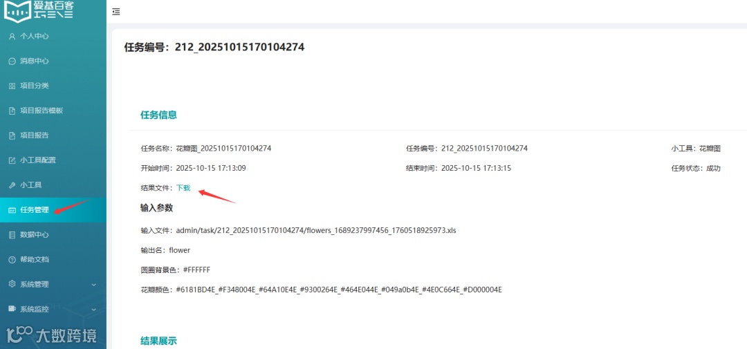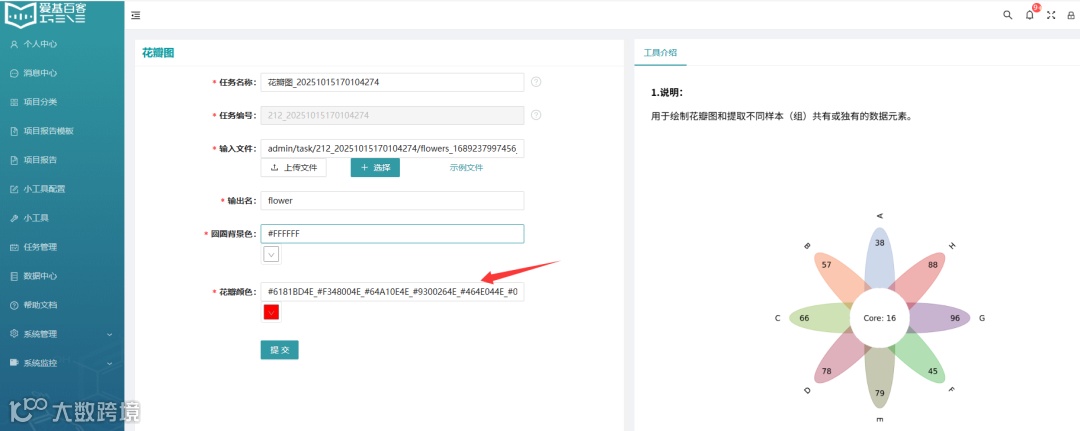 左侧是必要的输入文件和参数选项。任务名称和任务编号系统会自动生成。后面可用于记录查看具体的任务。其中花瓣中心和花瓣的叶子均可定制自己喜欢的颜色。中心圆圈默认白色。注意叶子的配色数需与集合数一致,中间用下划线分隔。示例文件里有8个集合,故这里填写“#6181BD4E_#F348004E_#64A10E4E_#9300264E_#464E044E_#049a0b4E_#4E0C664E_#D000004E”。