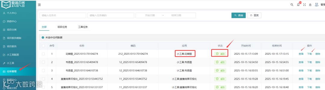您可在任务管理栏中查看任务的运行情况和结果。默认情况下新任务将会在最上方展示。也可通过任务名、任务编码、日期点击查询,找到需要的任务。 如下图:当状态成功时,表示任务成功结束。