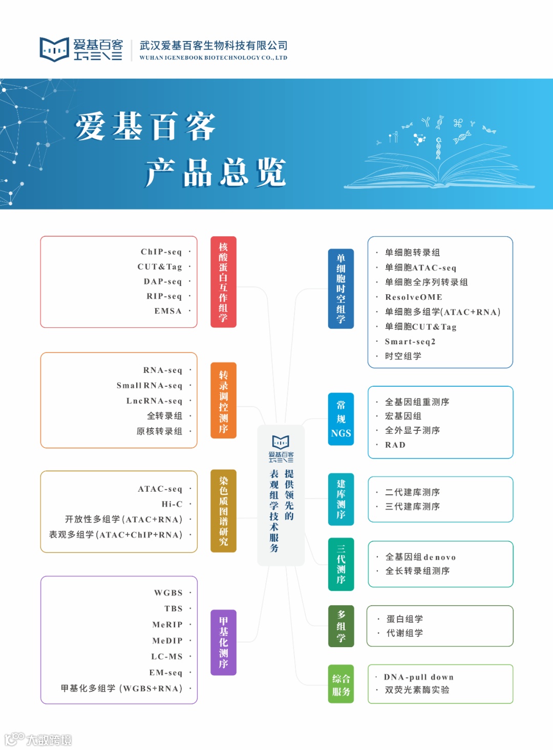 武汉爱基百客生物科技有限公司(简称:爱基百客,IGENEBOOK)是一家专注于表观组学、单细胞时空组学和高通量测序分析服务的新型生物科技企业。公司办公面积逾3000m2,员工已达到百余人,业务覆盖全国,核心团队来自国内知名高校和基因测序公司。公司先后引入ChIP、ATAC-seq、CUT&Tag、单细胞(进口、国产多平台)、DNBSEQ-T7、SURFSeq 5000和STOmics时空组学等平台,同时配备MGISP-960和AlphaTool等自动化设备。