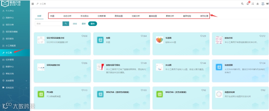 登录后,如下图,我们进入到小工具专栏。当前云平台已上线了33款小工具供大家使用,包括基础绘图、高级绘图、差异检验、聚类分析和序列处理等子模块,本着用户至上的理念,平台小工具将会持续更新维护,积极接受用户的反馈和意见。