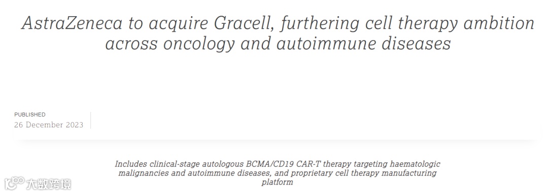 12月26日,阿斯利康宣布,已与亘喜生物(Gracell Biotechnology)达成协议,以约12亿美元的总价格收购后者。收购完成后,亘喜生物将作为阿斯利康的全资子公司,在中国和美国开展业务。