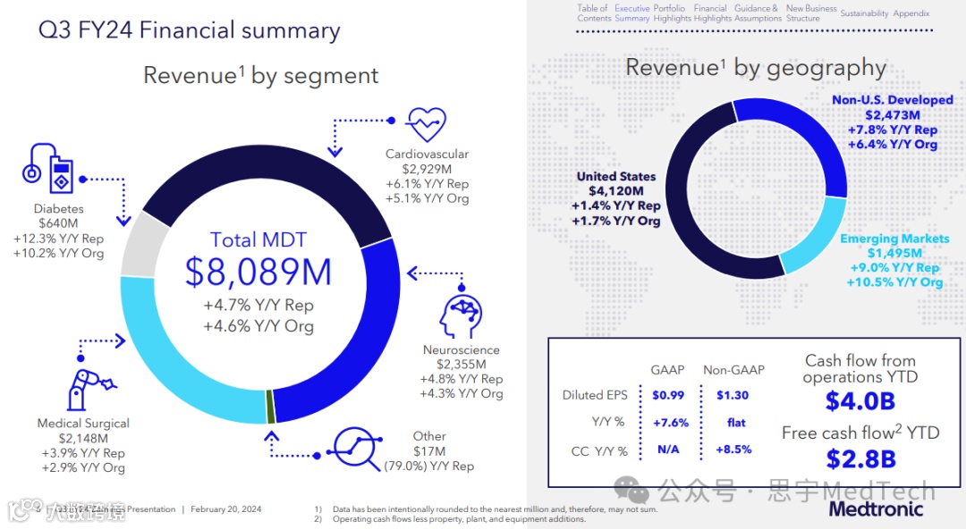 2024年2月20日,美敦力公布了2024财年截至1月26日的第三季度财报,报告显示公司季度营收为81亿美元(约582亿人民币),同比增长4.7%;季度净利润为13.4亿美元,同比增长8.8%。