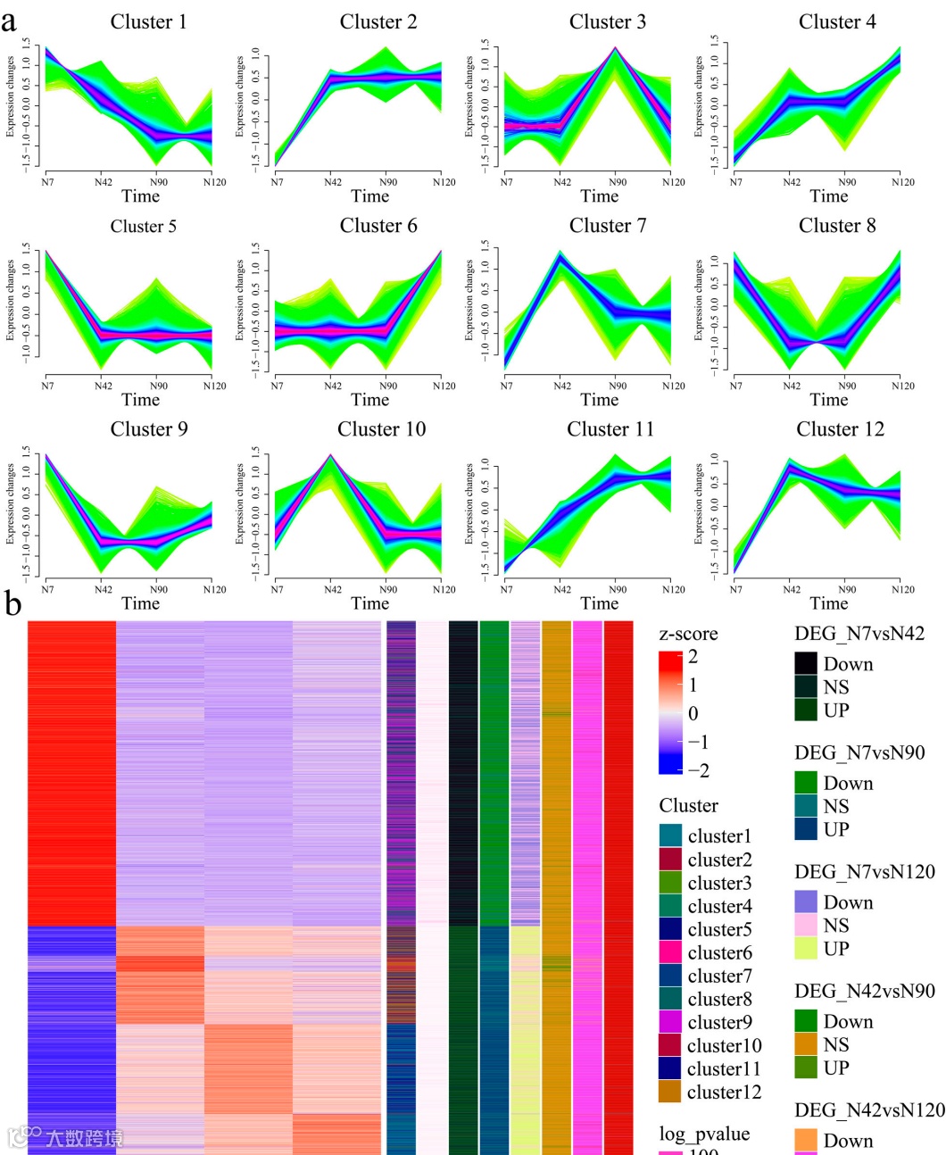 时序分析图(Time-series Analysis)是转录组数据分析中重要分析之一,用于研究基因表达随时间变化的模式。这种分析方法特别适用于研究基因在生物学过程中的动态调节,例如细胞周期、发育过程、疾病进展或对外界刺激的响应。通过时序分析,研究者可以揭示基因表达在时间维度上的复杂模式,为理解基因功能和调控机制提供深入见解。