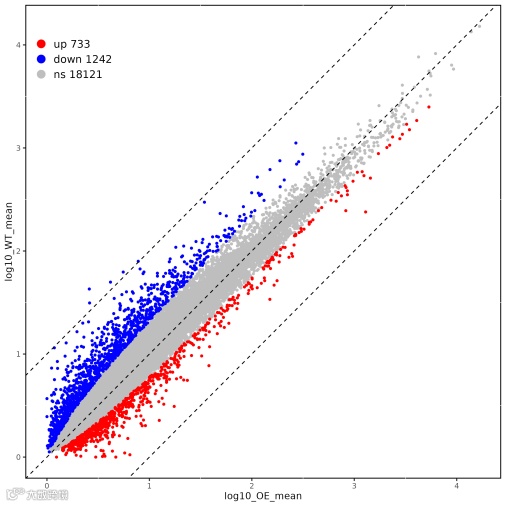 在转录组研究中,散点图通常用于展示基因的表达水平、差异表达情况以及相关性分析的结果。在二维散点图中,每个数据点代表一个样本或基因,横轴和纵轴分别表示两个变量或条件下的数值。通过观察散点图中数据点的分布和趋势,我们可以快速了解不同基因在不同条件下的表达水平、差异表达情况以及基因之间的相关性。散点图可以帮助我们发现异常样本、群体聚类以及基因表达模式等重要信息。