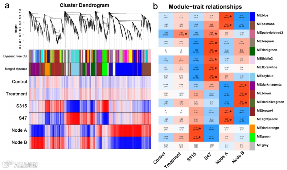 Cluster Dendrogram(簇群树状图):用于展示样本或基因之间的聚类关系,显示不同模块的聚类结构和关系。Module-trait relationships(模块与特征的关联矩阵):显示不同模块与外部特征(如实验条件、表型数据等)之间的相关性,用颜色表示相关性程度。模块(Module):通过不同颜色或标识符表示的基因集合,具有相似的表达模式和生物学功能。