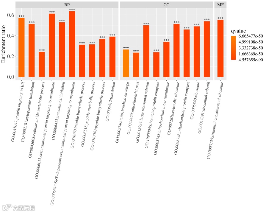 以GO富集分析的柱状图为例,通常X轴表示不同的 GO 本体或者具体的 GO 项,Y轴表示富集分析的结果,比如富集因子、p值或者基因数(或富集的比例)。柱状图中的颜色通常用于区分不同的GO本体或者不同的富集结果。每种颜色可能代表一个不同的功能类别或者富集水平。柱状图上可以标注统计显著性的信息。