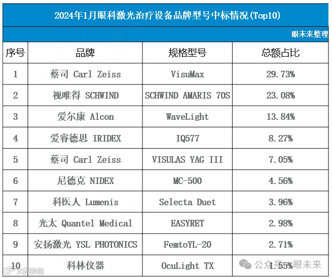从型号上观察,2024年1月份,蔡司型号为VisuMax的眼科激光治疗设备排名第一,其中标总额占比为29.73%;位居第二的是视唯得的SCHWIND AMARIS 750S,中标总额占比为23.08%;爱尔康排名第三,型号为WaveLight FS200,中标总额占比为13.84%。