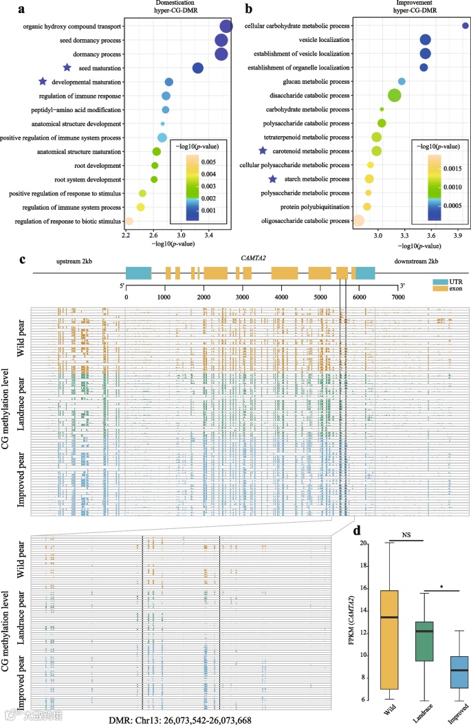 研究总共鉴定出5591个差异甲基化区域(DMRs)。在梨的驯化和改良过程中,CG和CHG中的甲基化经历共同进化。DMRs比选择性扫描区域具有更高的遗传多样性,特别是在内含子中。大约97%的DMRs与任何SNPs无关,这些DMRs与淀粉和蔗糖代谢以及苯丙烷生物合成相关。此外,研究还进行DNA甲基化与基因表达的相关性分析。分析结果表明,高甲基化DMRs基因与果实成熟显著相关,进一步验证与高甲基化DMRs相关基因CAMTA2的功能,并在番茄和梨愈伤组织中验证CAMTA2过表达抑制了果实成熟。该研究为揭示多年生果树驯化和改良过程中表观遗传调控重要性状的作用机制提供参考,为指导梨重要性状遗传改良提供了理论依据。