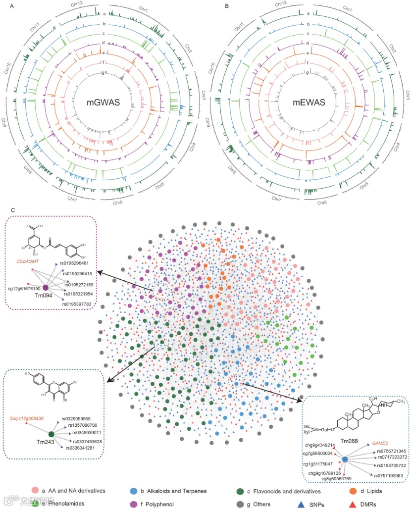 此外,研究还对来自364个不同种质的339种代谢物进行代谢组学分析,并进一步进行基于SNP和DMR的代谢关联研究,分别通过SNP和DMR标记检测到971和711个大效应位点。结合多组学共鉴定出13个候选基因并更新了多酚生物合成通路。本研究结果表明,DNA甲基化变化可以补充代谢物多样性的SNP图谱。总之,本研究通过WGBS测序等组学研究为不同种质绘制了全面的DNA甲基化图谱,并表明DNA甲基化变化可能是植物代谢多样性的遗传基础。