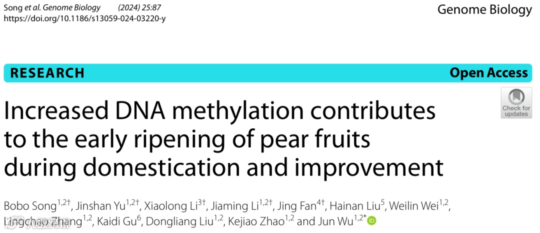 梨(Pyrus ssp.,蔷薇科杏仁核亚科)是世界上最重要的温带水果作物之一。与野生梨相比,栽培梨的果实在许多形态特征上表现出显著变化,包括果实大小、含糖量和核细胞含量。野生梨和栽培梨之间的比较分析可以深入了解关键表型变化的演变。2024年4月5日,南京农业大学吴俊教授团队对41份亚洲梨(Pyruspyrifolia)样本(包括野生品种、地方品种和改良品种)进行了单碱基分辨率的甲基化分析。与水稻驯化期间的显著减少相反,研究结果表明梨驯化和改良过程中整体DNA甲基化水平增加。梨的DNA甲基化特定增加与人类选择导致的Demeter-like1(DML1,编码DNA去甲基化酶)的下调显著相关。