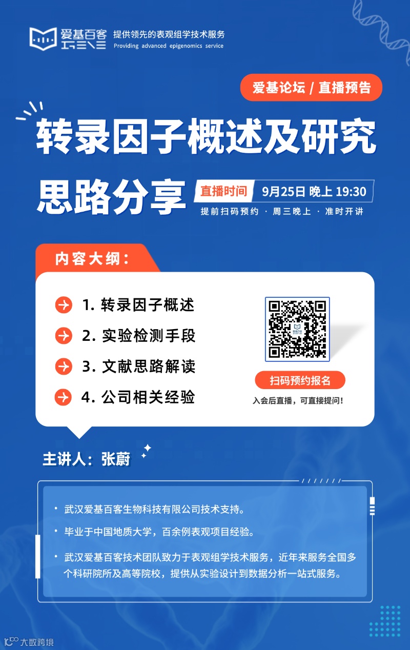 想了解转录因子在基因调控中的关键角色吗?希望掌握最新的研究方法和思路?本次直播将为您深入解析转录因子的功能,并分享如何设计实验以探索其在生物学中的应用。本周三(9月25日)晚上19:30 ,在爱基百客视频号直播间准点开始“转录因子概述及研究思路分享”直播课程,由我们的资深技术支持张蔚和大家分享转录因子的研究切入点和思路。欢迎大家来直播间和我们交流~