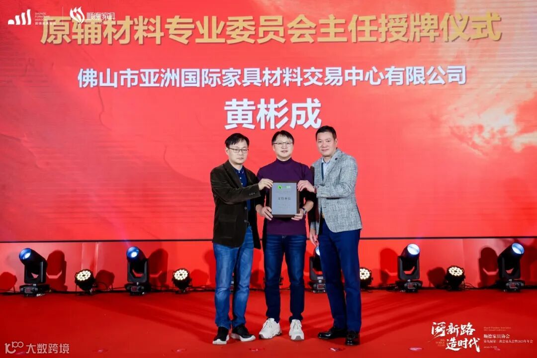 赵松顺与左建华向专委会主任单位——佛山市亚洲国际家具材料交易中心有限公司黄彬成颁牌。
